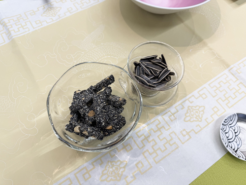 以前からワークショップにご参加いただいている方にはおなじみですが、北京姉妹店スタッフのお母さま手作りのゴマのお菓子です。毎年春節の時期にお母さま自ら作ってくださるお菓子で、今年もいただきましたのでお裾分けです。売っているものと違い、余計なものが入っていないので美味しいんですよね。また、もう1つはヒマワリの種です。単純にローストしただけのものですが、中国では昔からお茶請けとして親しまれています。町中にある専門店で都度ローストしているもので、素朴だけど意外と止まらなくなる美味しさだったりします。食べ方と合わせてご紹介させていただきました。